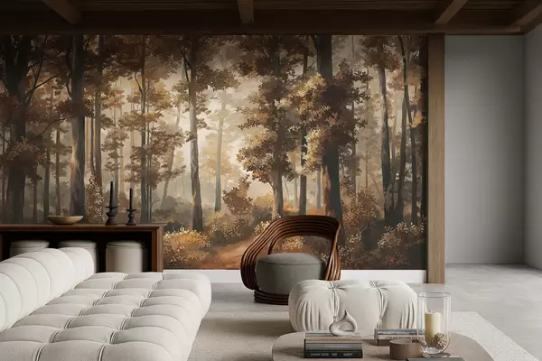 Fotomurales Escena otoñal en el bosque con luz cálida y árboles densos. Nr. w05089v1