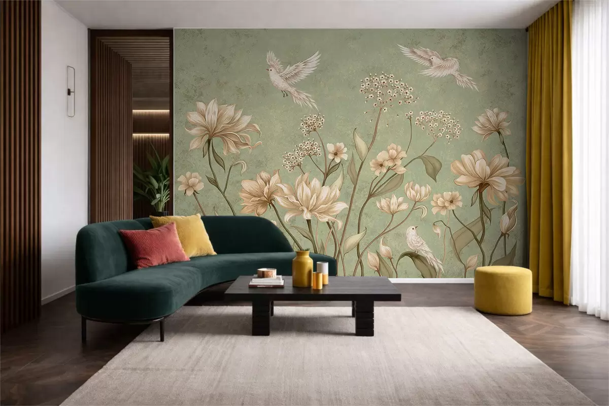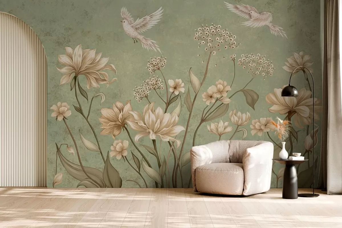 Fotomurales Flores y pájaros sobre un fondo verde con textura Nr. w05118v1