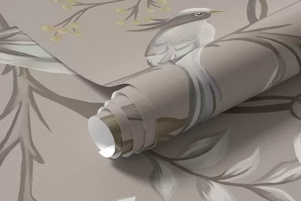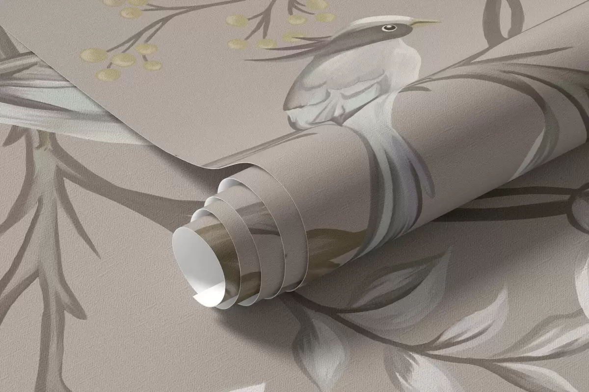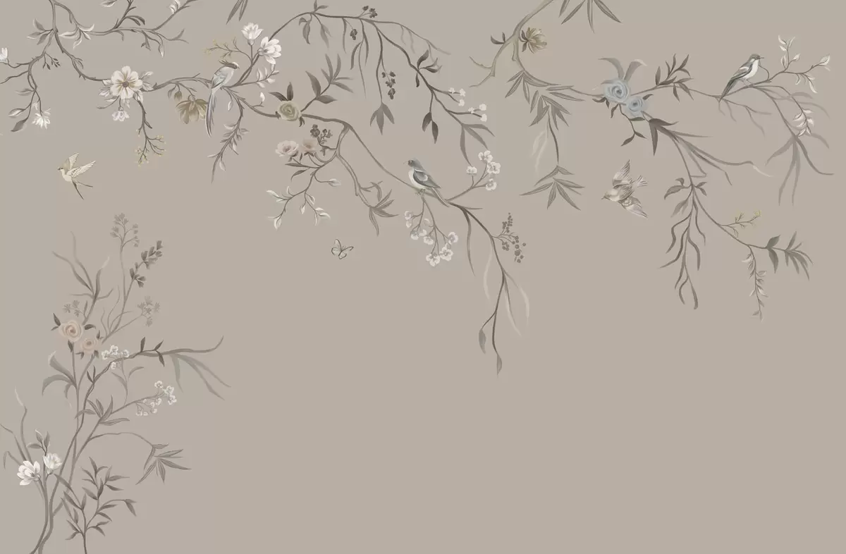 Fotomurales Adorno floral con pájaros sobre fondo neutro Nr. w05127v3