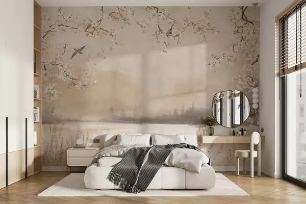 Fotomurales Delicadas ramas en flor junto al lago con pájaros en una ligera niebla. Nr. w05155