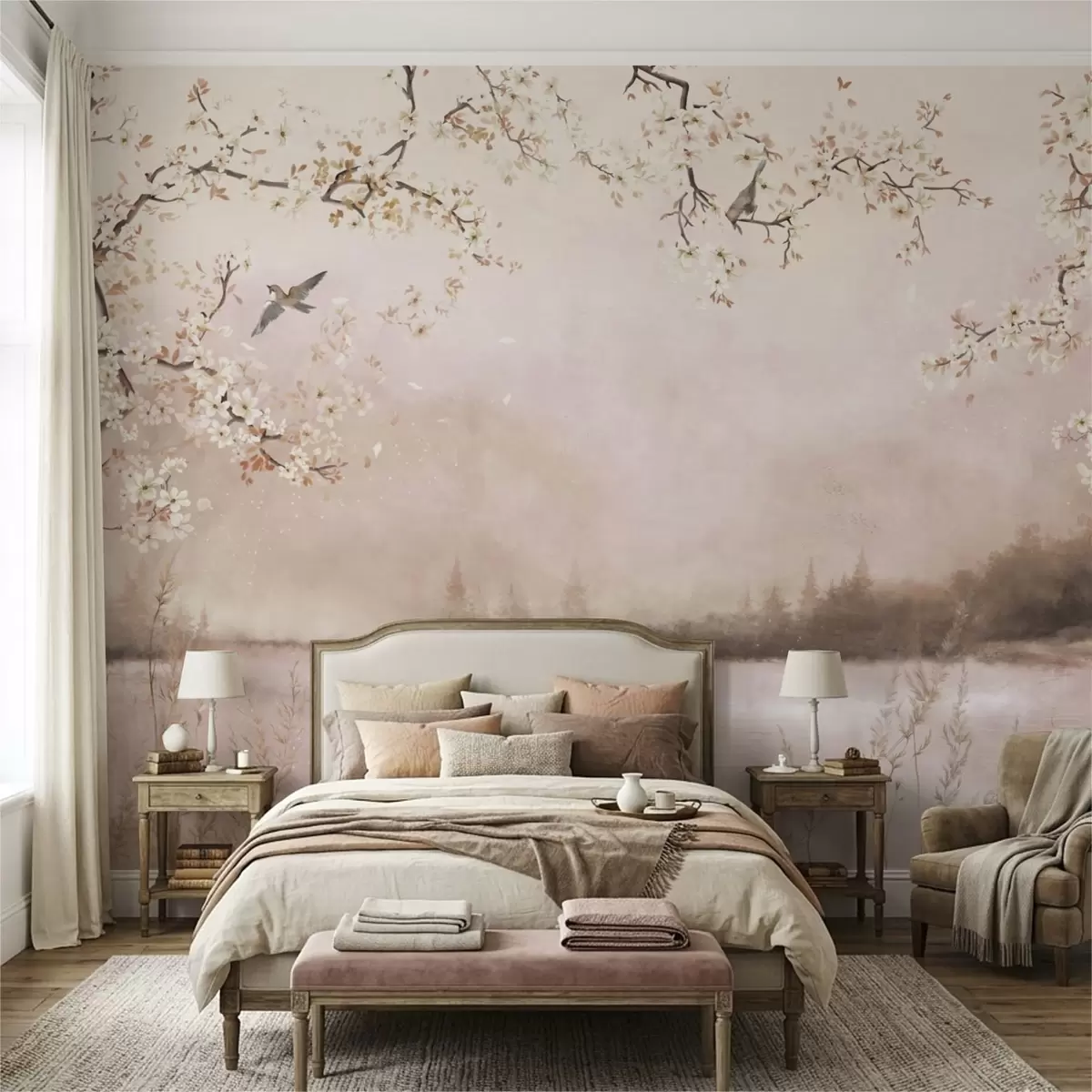 Fotomurales Ramas en flor sobre un lago tranquilo con pájaros en la niebla. Nr. w05155v1