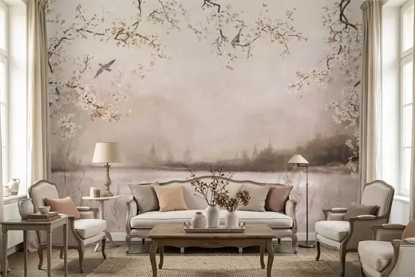 Fotomurales Ramas en flor sobre un lago tranquilo con pájaros en la niebla. Nr. w05155v1