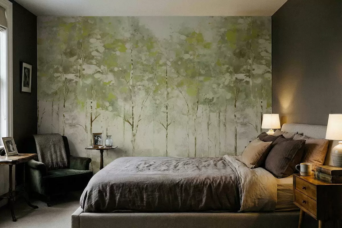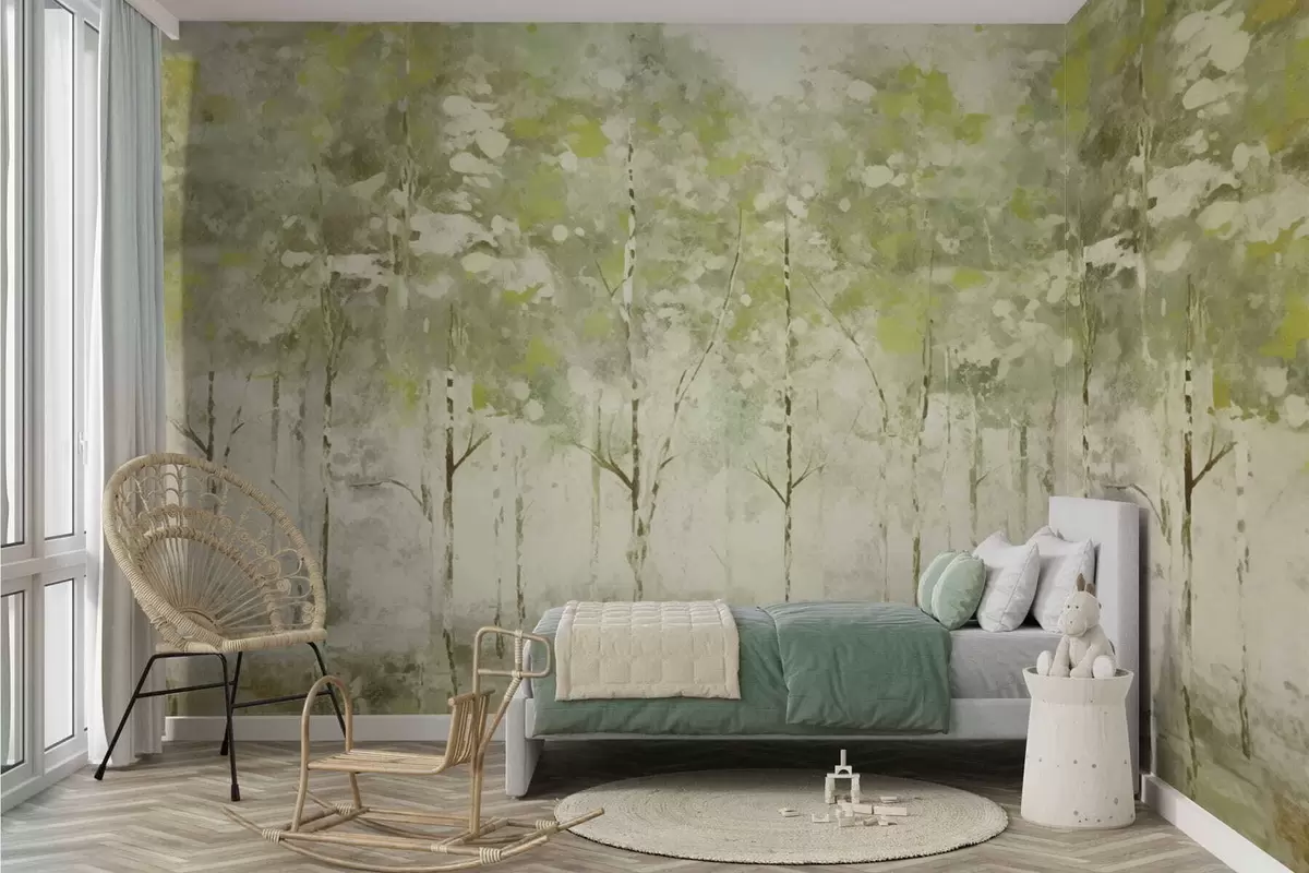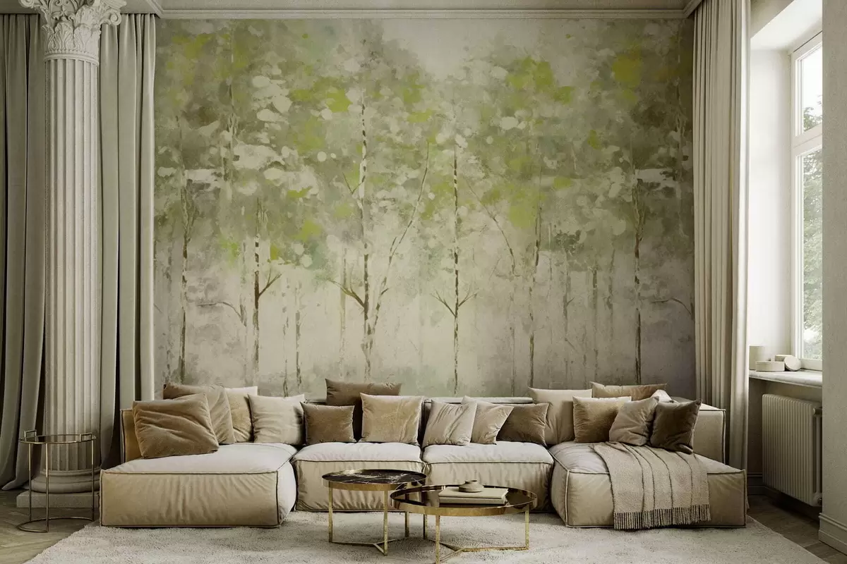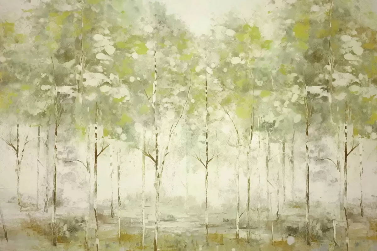 Fotomurales Bosque estilizado con árboles esbeltos en tonos verdes. Nr. w05221v1