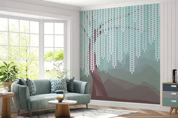 Fotomurales Árbol de sauce estilizado con hojas colgantes sobre un fondo de montañas minimalistas en tonos chocolate y turquesa. Nr. w05232v1