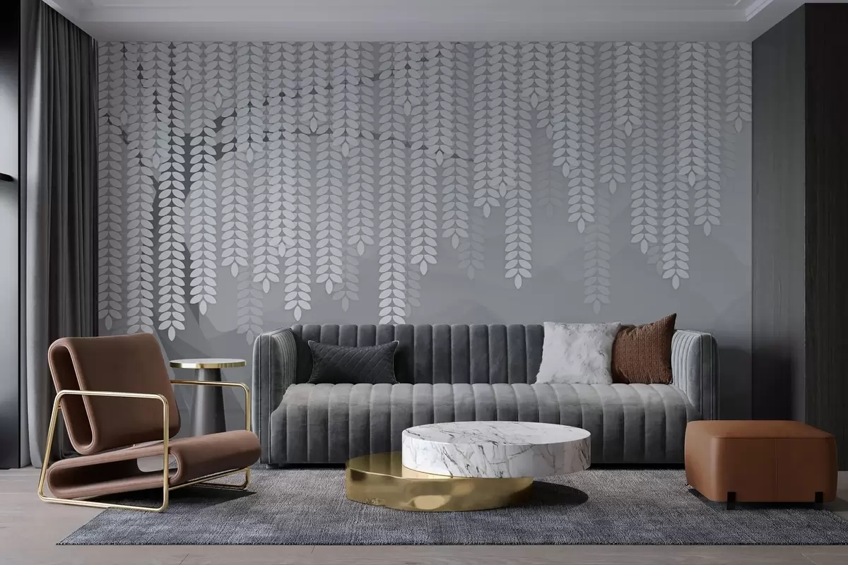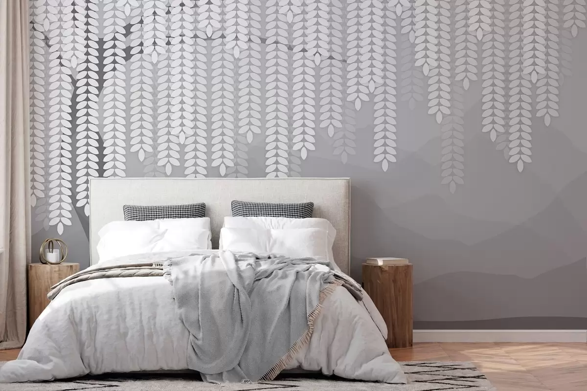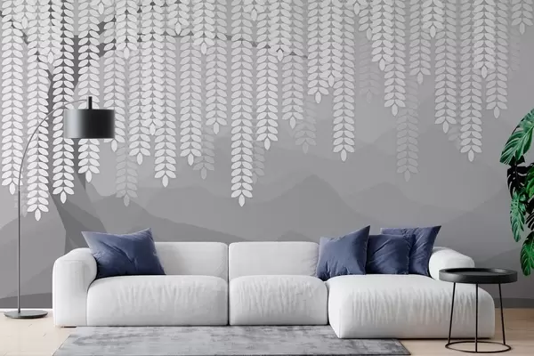 Fotomurales Sauce estilizado con hojas colgantes sobre un fondo de montañas minimalistas en tonos grises. Nr. w05232v3