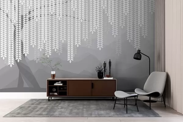 Fotomurales Sauce estilizado con hojas colgantes sobre un fondo de montañas minimalistas en tonos grises. Nr. w05232v3