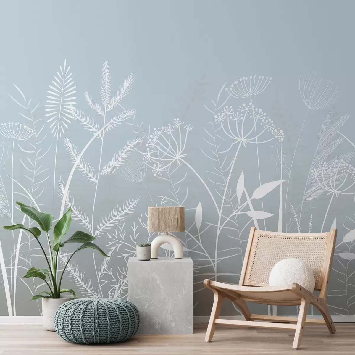Fotomurales delicadas hierbas silvestres y flores pintadas a mano sobre un fondo gris azulado Nr. w05383