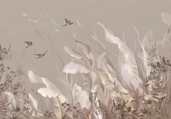 Fotomurales Plumas suaves, hierbas y pájaros en tonos claros Nr. w05395
