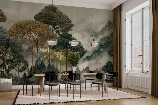 Fotomurales Bosque con árboles altos en montañas envueltas en niebla Nr. w05410