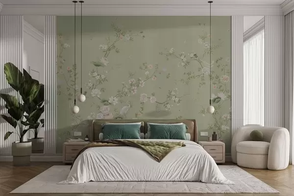 Fotomurales Ramas en flor con pájaros sobre un fondo verde claro Nr. w05416