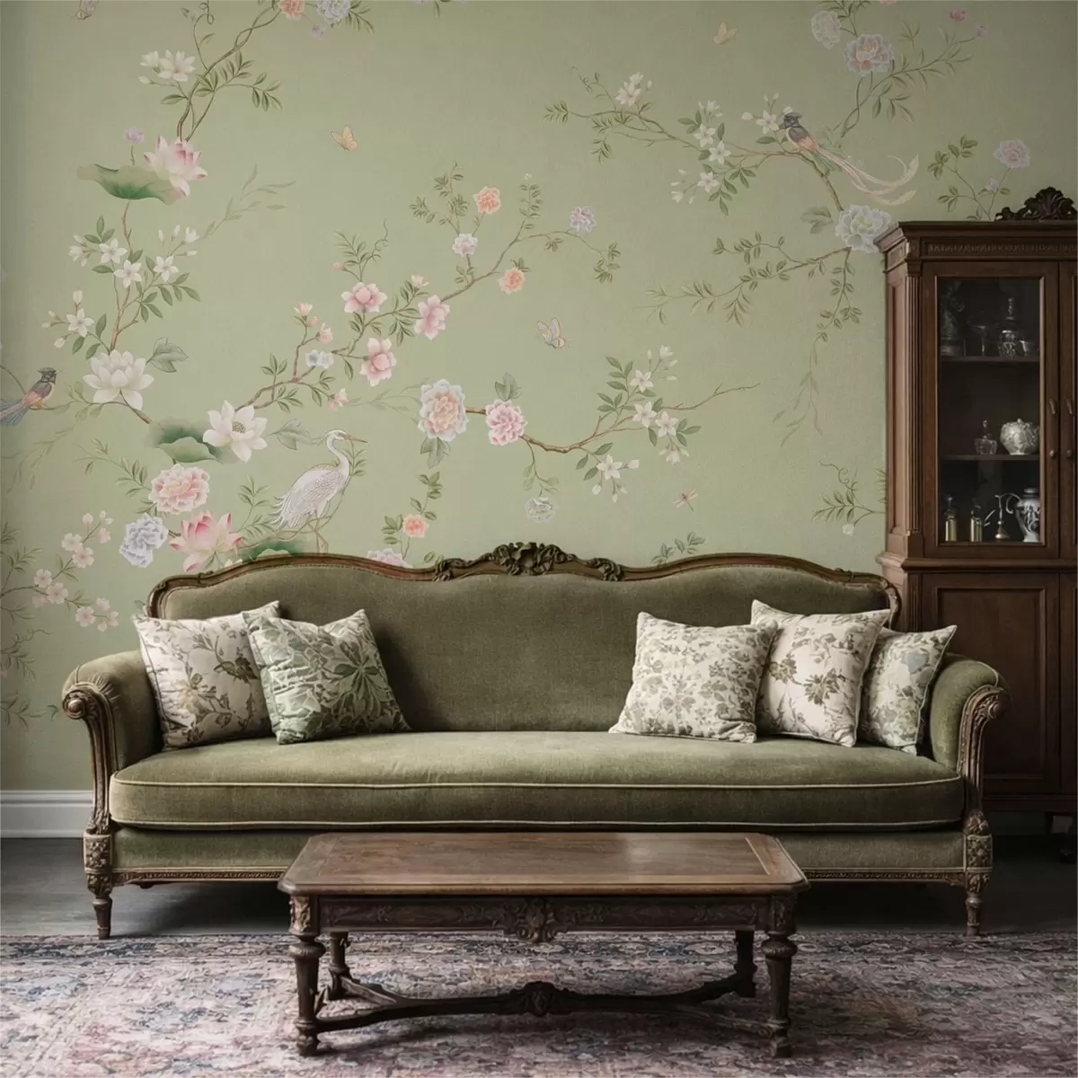Fotomurales Ramas en flor con pájaros sobre un fondo verde claro Nr. w05416