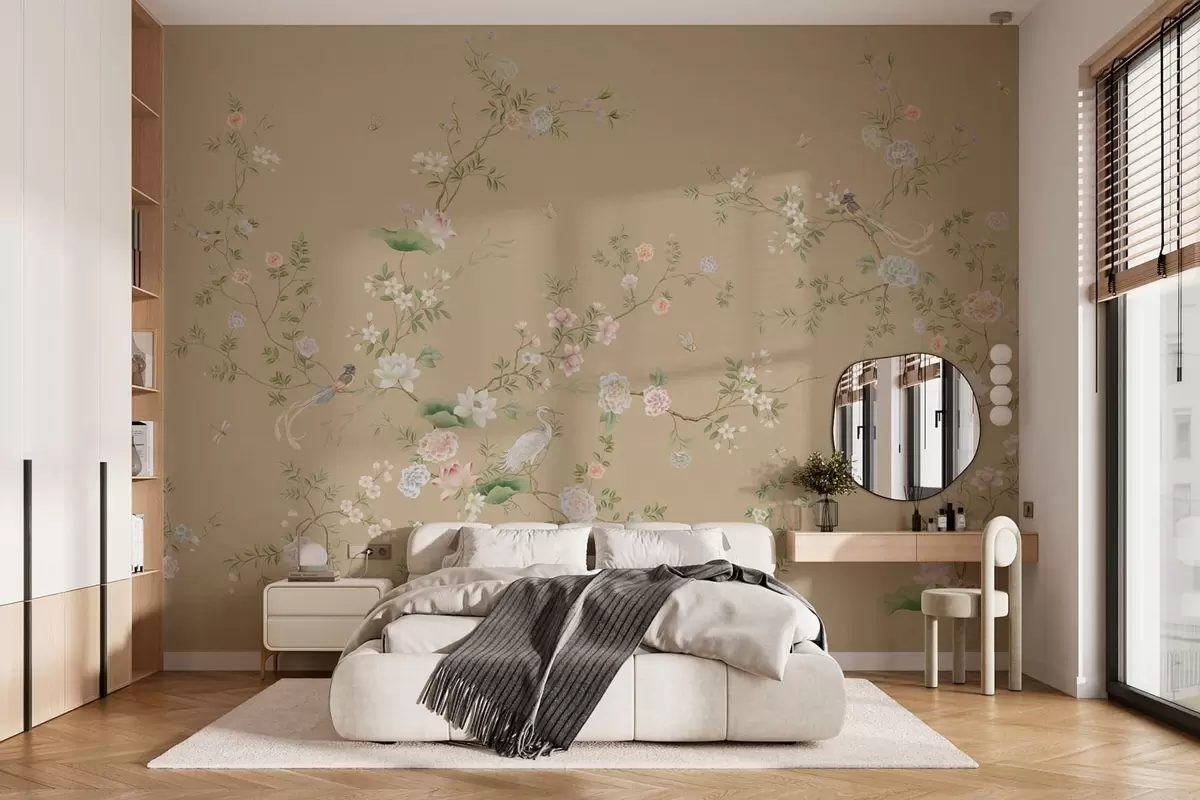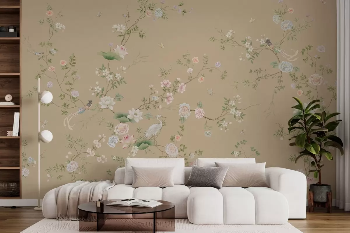 Fotomurales Ramas en flor con pájaros sobre un fondo beige cálido Nr. w05416v2