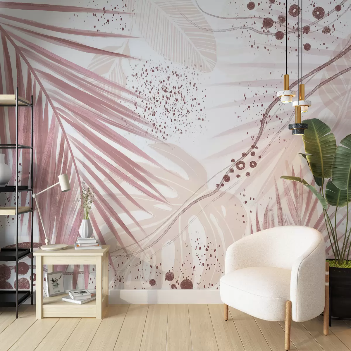 Fotomurales Hojas y frondas de palmeras de color rosa tropical, con formas abstractas y salpicaduras en tonos de rosa y blanco Nr. w07918v1
