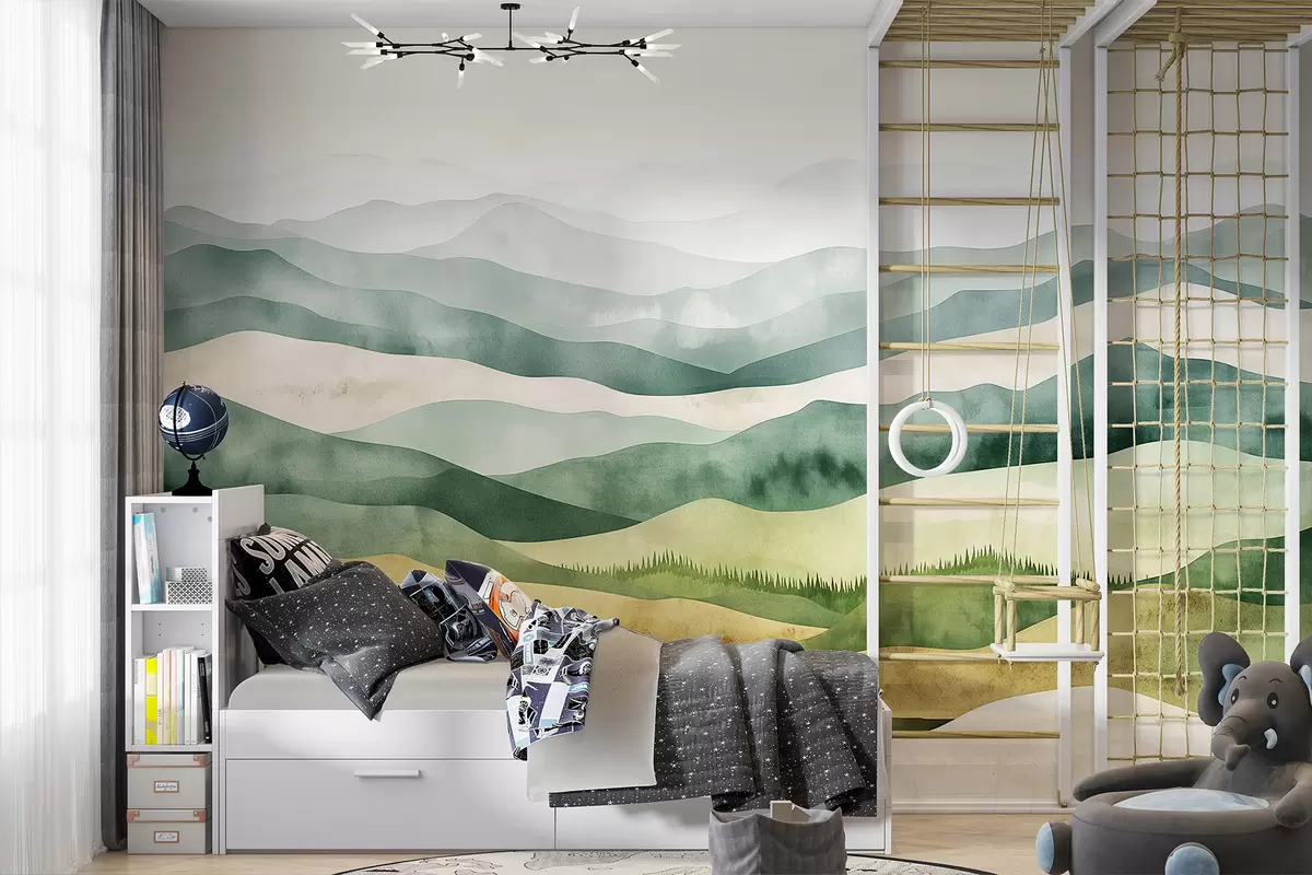 Fotomurales Paisajes de montañas acuarelas, bosques, colores verdes y beige naturales. Nr. w07950