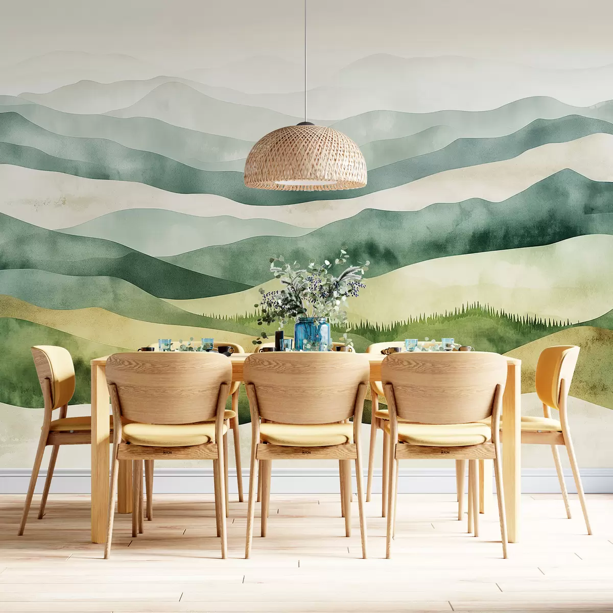 Fotomurales Paisajes de montañas acuarelas, bosques, colores verdes y beige naturales. Nr. w07950