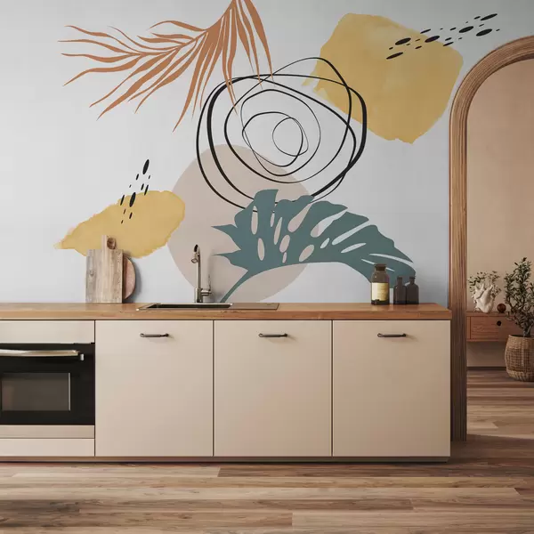 Fotomurales Abstracción boho, monstera tropical y hoja de palma, geométrica, mancha de acuarela, líneas, color azul, rojo, amarillo Nr. w07959