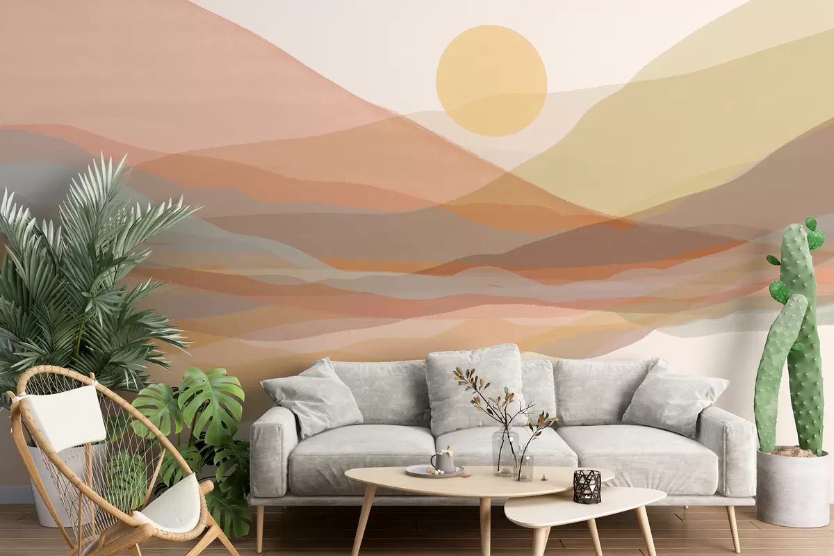 Fotomurales Paisaje montañoso con un cálido sol en el cielo, colinas en tonos naranja, amarillo y marrón. Nr. w07976