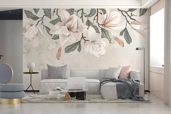 Fotomurales Delicadas flores de magnolia rosa y blanca con hojas verdes sobre un fondo claro, una composición floral suave Nr. w07977