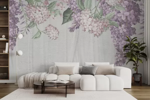 Fotomurales Un estampado floral con flores blancas y violetas, lilas con hojas verdes sobre un fondo textil de textura clara Nr. w07984