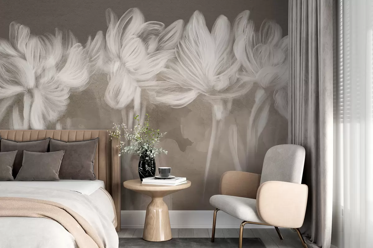 Fotomurales Suave minimalismo siluetas florales blancas transparentes sobre fondo de textura marrón Nr. w07986
