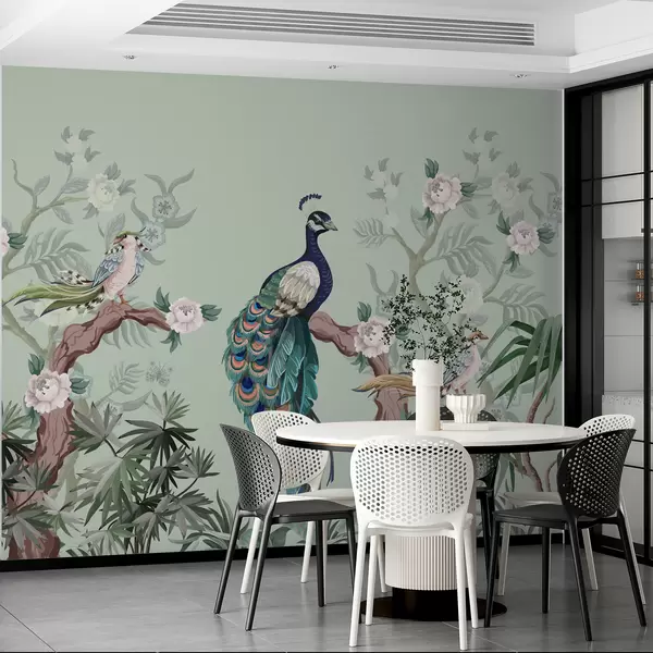 Fotomurales pavo real en un árbol, fondo verde Nr. w08168v1