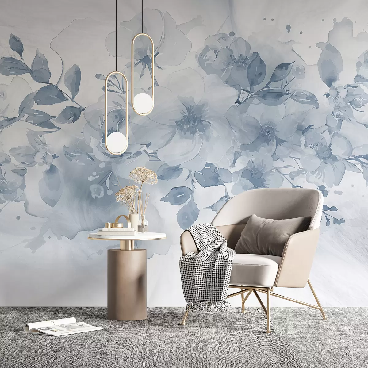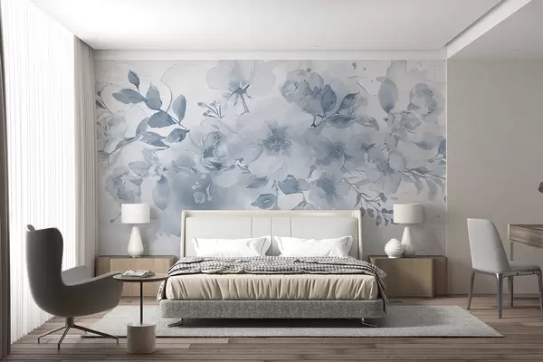 Fotomurales Patrón floral suave y difuminado en tonos grises y blancos, con delicadas flores y hojas. Nr. w08189