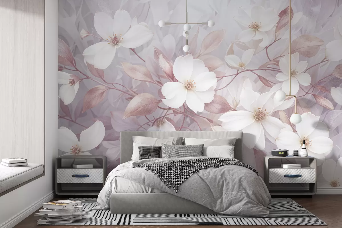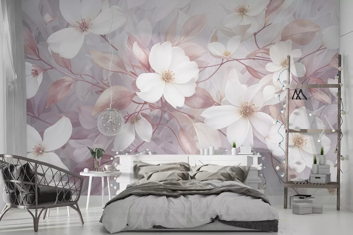 Fotomurales Delicadas flores de magnolia rosadas y blancas que florecen en ramas suaves y borrosas sobre un fondo pálido. Nr. w08196