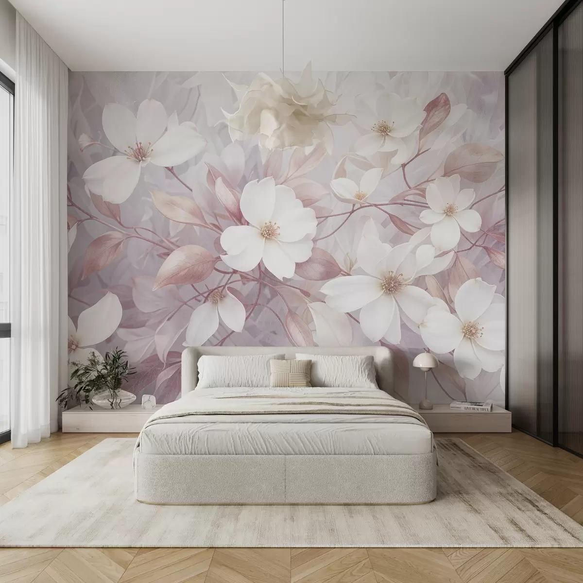 Fotomurales Delicadas flores de magnolia rosadas y blancas que florecen en ramas suaves y borrosas sobre un fondo pálido Nr. w08196