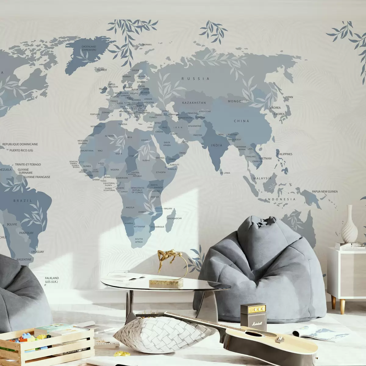 Fotomurales Mapa del mundo elegante con hojas y plantas de color azul Nr. w08211v4