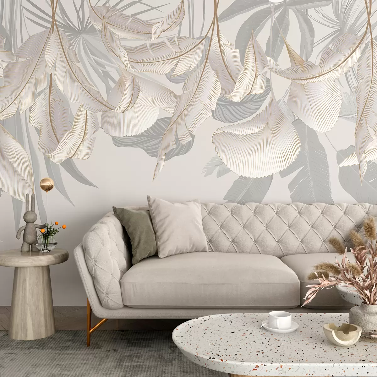 Fotomurales Delicadas hojas tropicales florales blancas y grises que crean un fondo suave y etéreo Nr. w08217