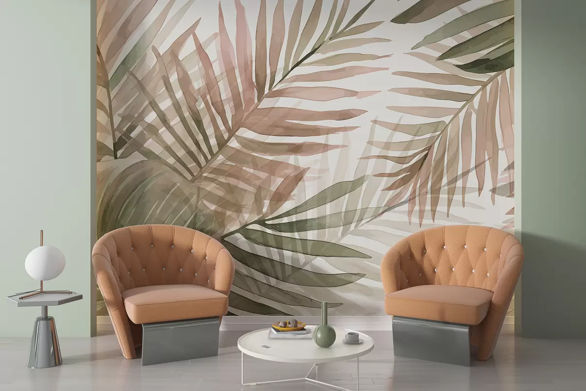 Fotomurales Hojas de palmera en acuarela en varios tonos de verde y rosa sobre un fondo claro. Nr. w08218