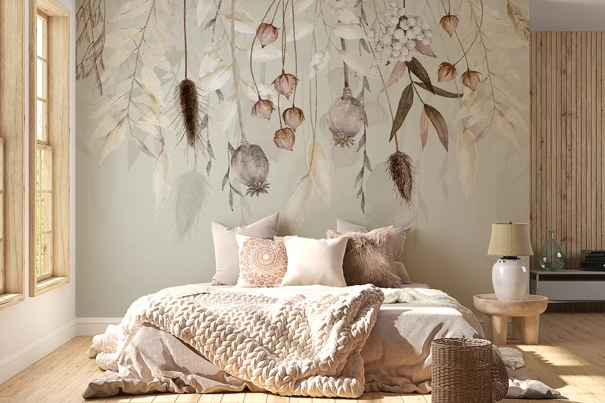 Fotomurales Delicado arreglo floral con flores secas, hojas y plumas colgando sobre un fondo suave. Nr. w08230