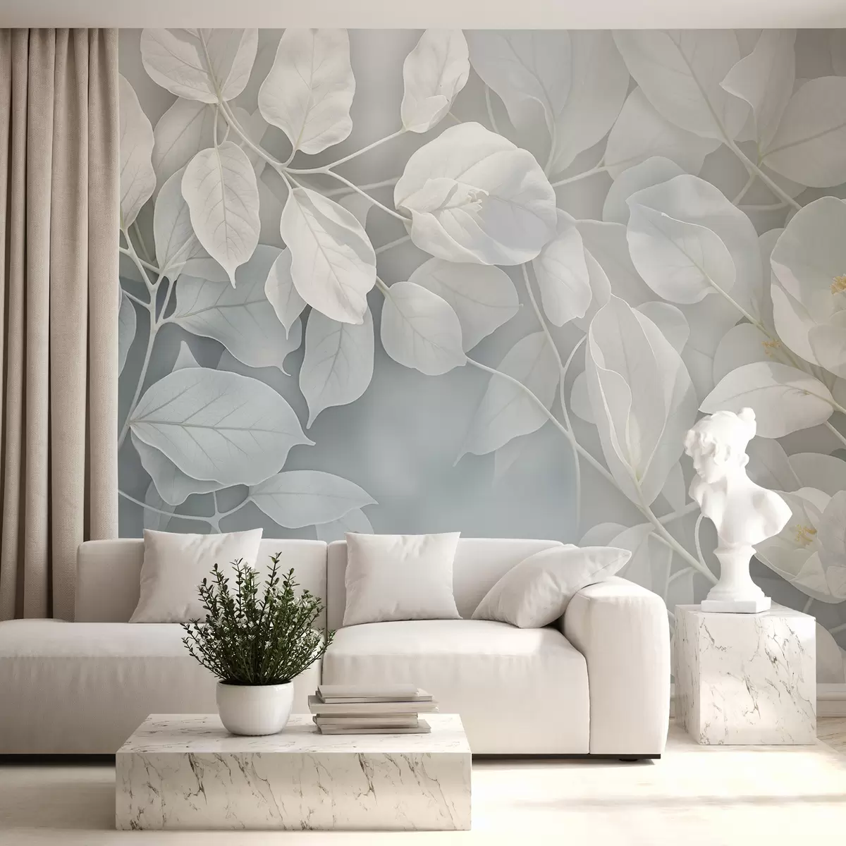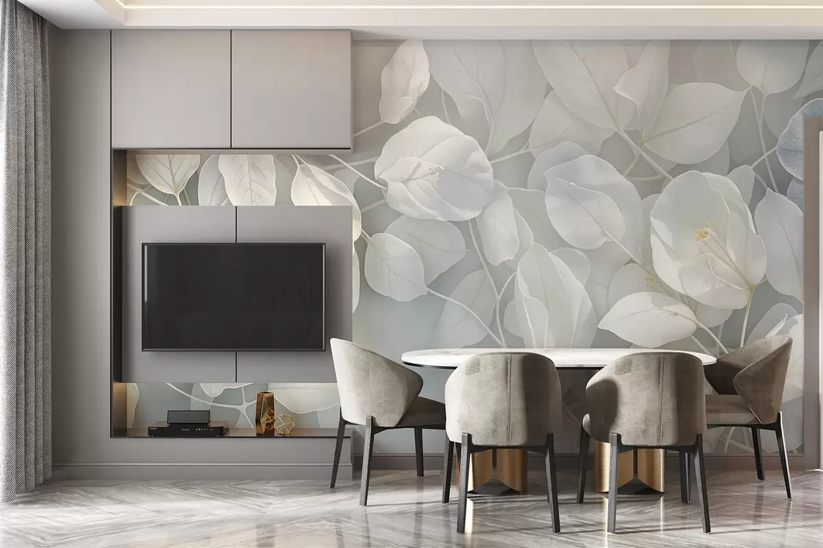 Fotomurales Flores blancas suaves y delicadas con hojas de color verde grisáceo sobre un fondo borroso, creando una atmósfera serena. Nr. w08232