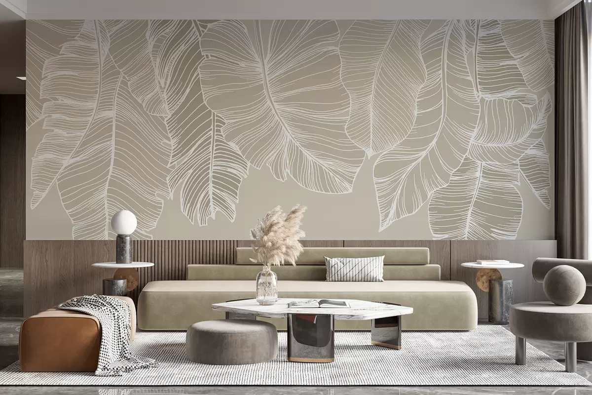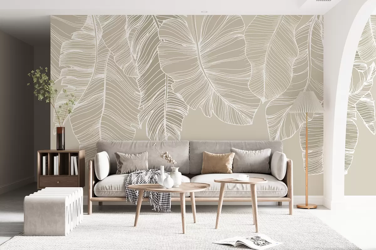 Fotomurales Hojas florales tropicales blancas con fondo beige claro, diseño de arte lineal minimalista. Nr. w08235