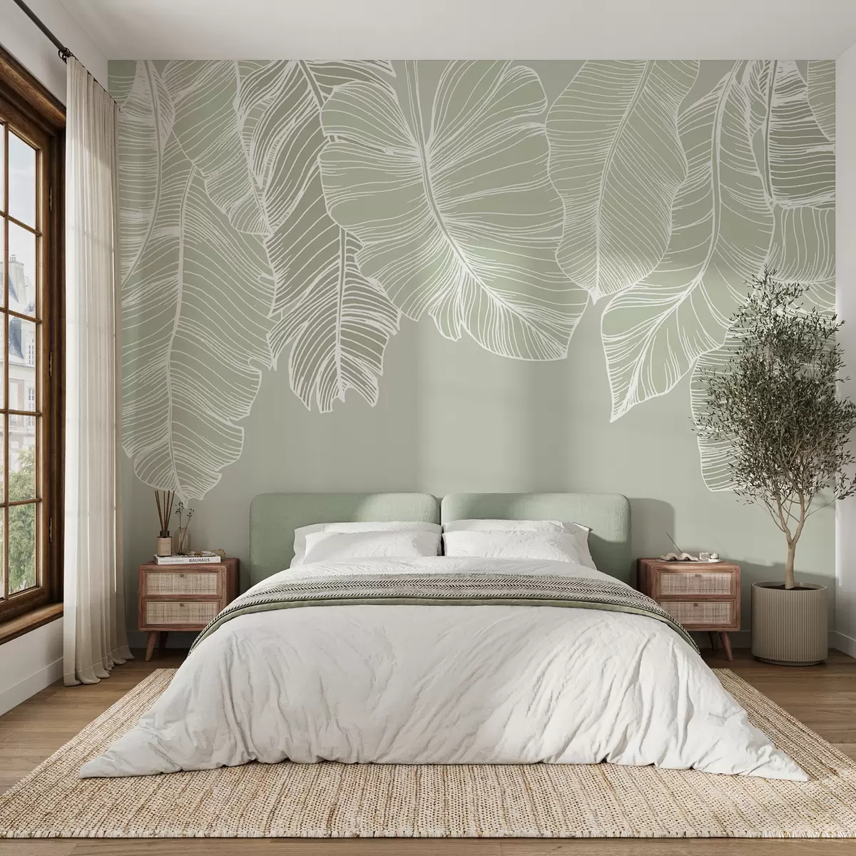 Fotomurales Hojas florales tropicales blancas con fondo verde claro, diseño de arte lineal minimalista. Nr. w08235v1