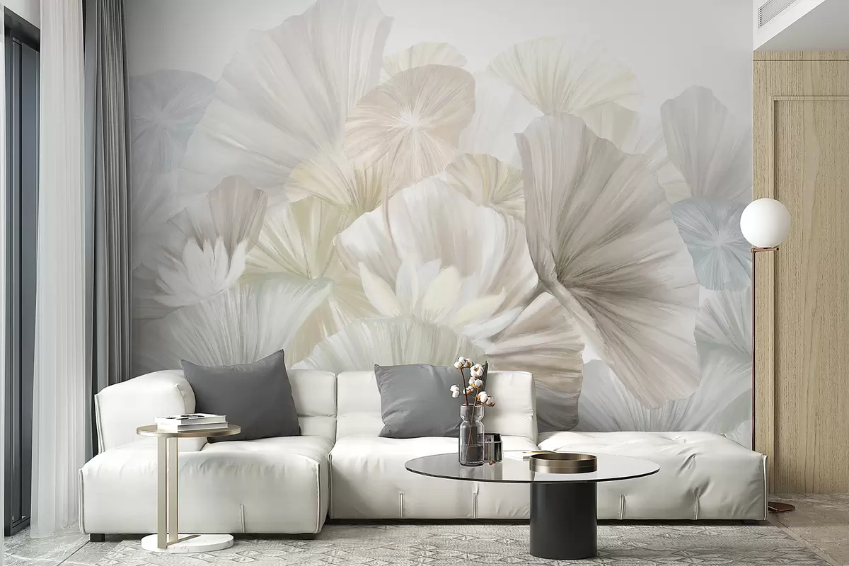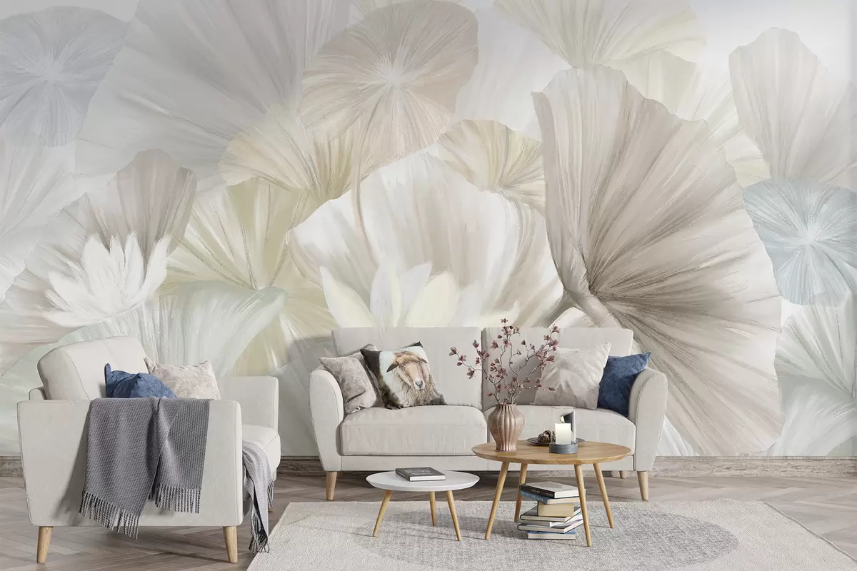 Fotomurales Delicadas hojas de loto verde con flores blancas de pétalos suaves y plumosos dispuestas en una composición artística natural Nr. w08265