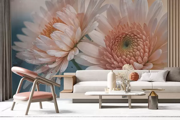 Fotomurales Flores de margarita gerbera de color rosa suave con delicados pétalos y textura sobre un fondo azul claro Nr. w08272