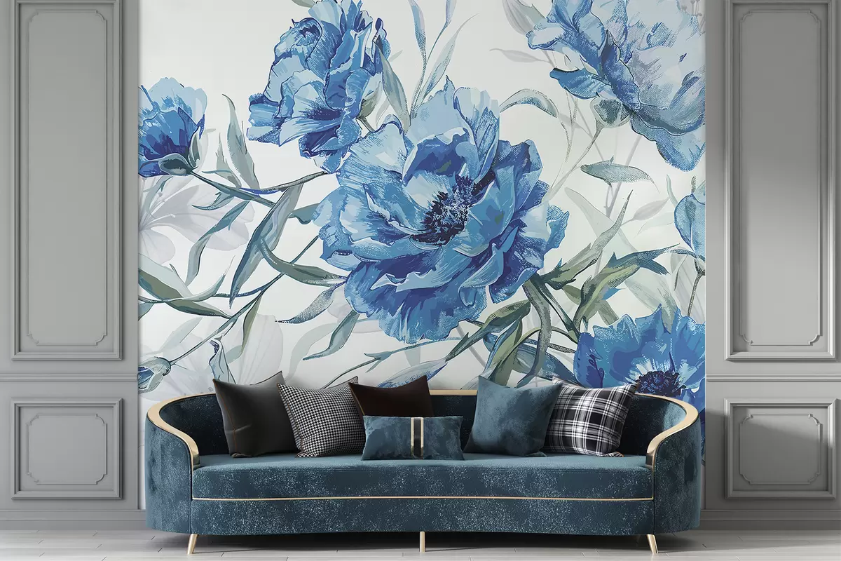 Fotomurales Pintura de peonías azules con exuberante follaje sobre un fondo abstracto claro Nr. w08274v1