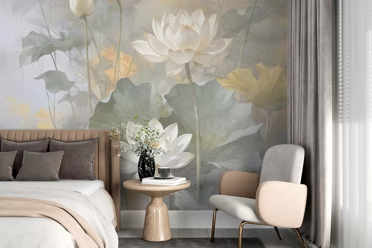 Fotomurales Flores de loto blancas con hojas en un estanque con un suave fondo difuminado amarillo y verde Nr. w08275