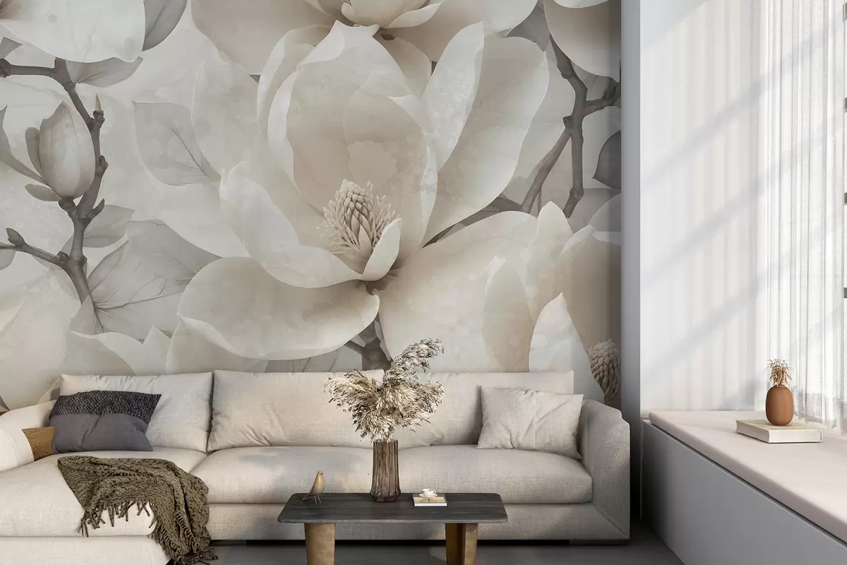 Fotomurales Flores blancas de magnolia en plena floración, con pétalos suaves y delicados y un fondo natural texturizado Nr. w08278