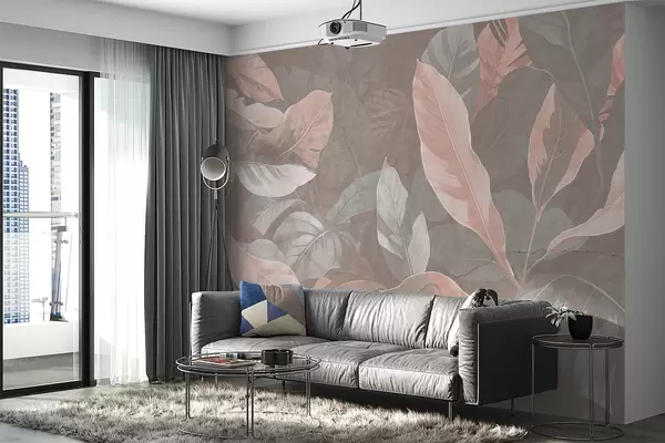 Fotomurales Estampado abstracto con delicadas hojas blancas, beige y melocotón sobre un fondo de textura suave y apagada Nr. w08322v1