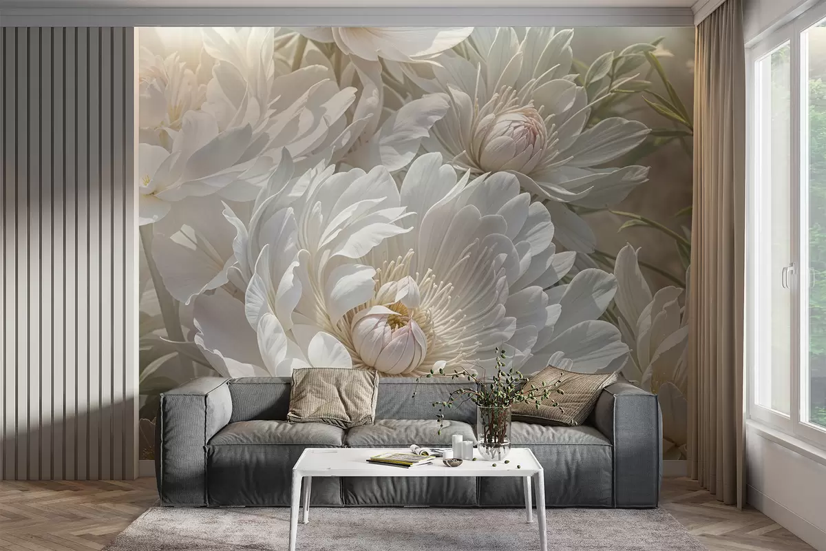 Fotomurales Primer plano de grandes y delicadas flores blancas de peonía con pétalos suaves y esponjosos y centros de color amarillo pálido Nr. w08325