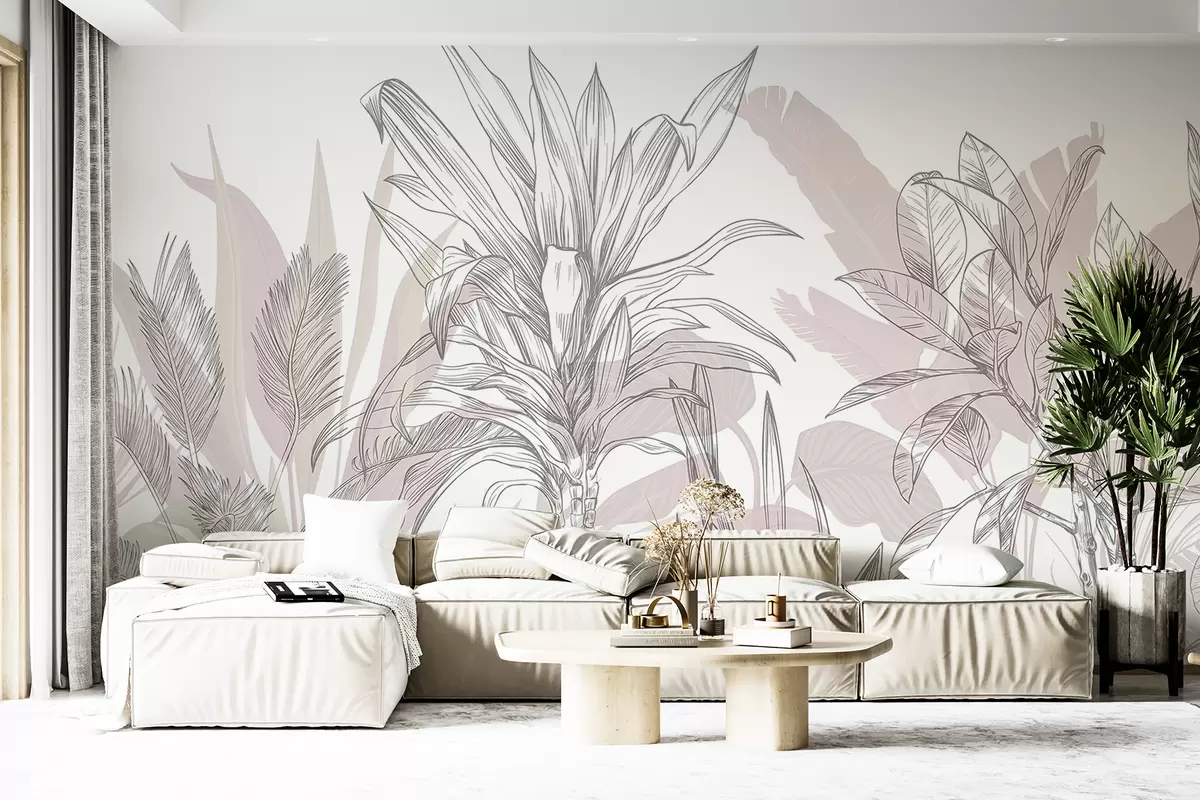 Fotomurales Un gráfico de plantas tropicales con grandes y exuberantes hojas y flores en tonos grises y blancos con siluetas florales rosas Nr. w08327v1