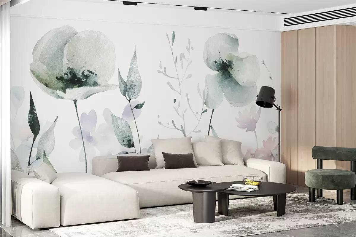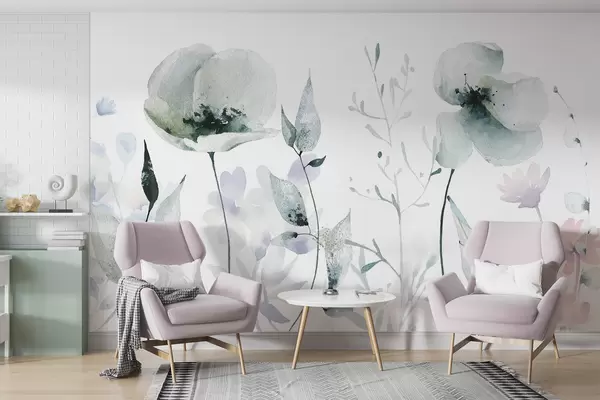 Fotomurales Flores de acuarela en tonos pastel con delicados pétalos y hojas, en tonos grises, blancos y rosa claro sobre fondo blanco Nr. w08332