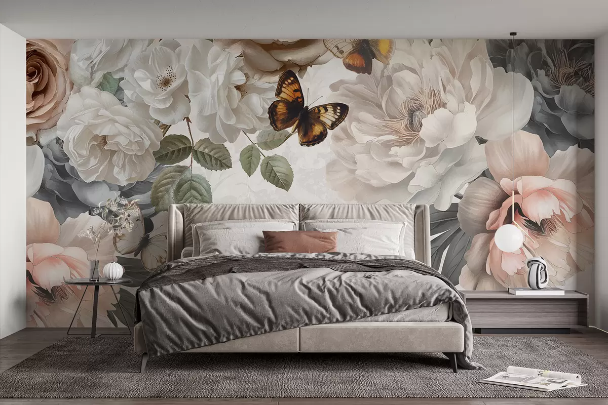 Fotomurales Grandes flores de peonía blancas y rosas con una mariposa posada en una de las flores sobre un fondo suave y difuminado Nr. w08340