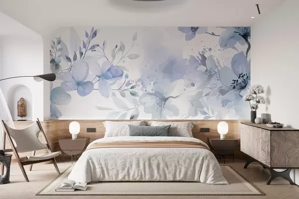 Fotomurales Un ramo de delicadas flores azules y blancas con pétalos suaves y difuminados sobre un fondo de acuarela ligero y aireado Nr. w08348v1