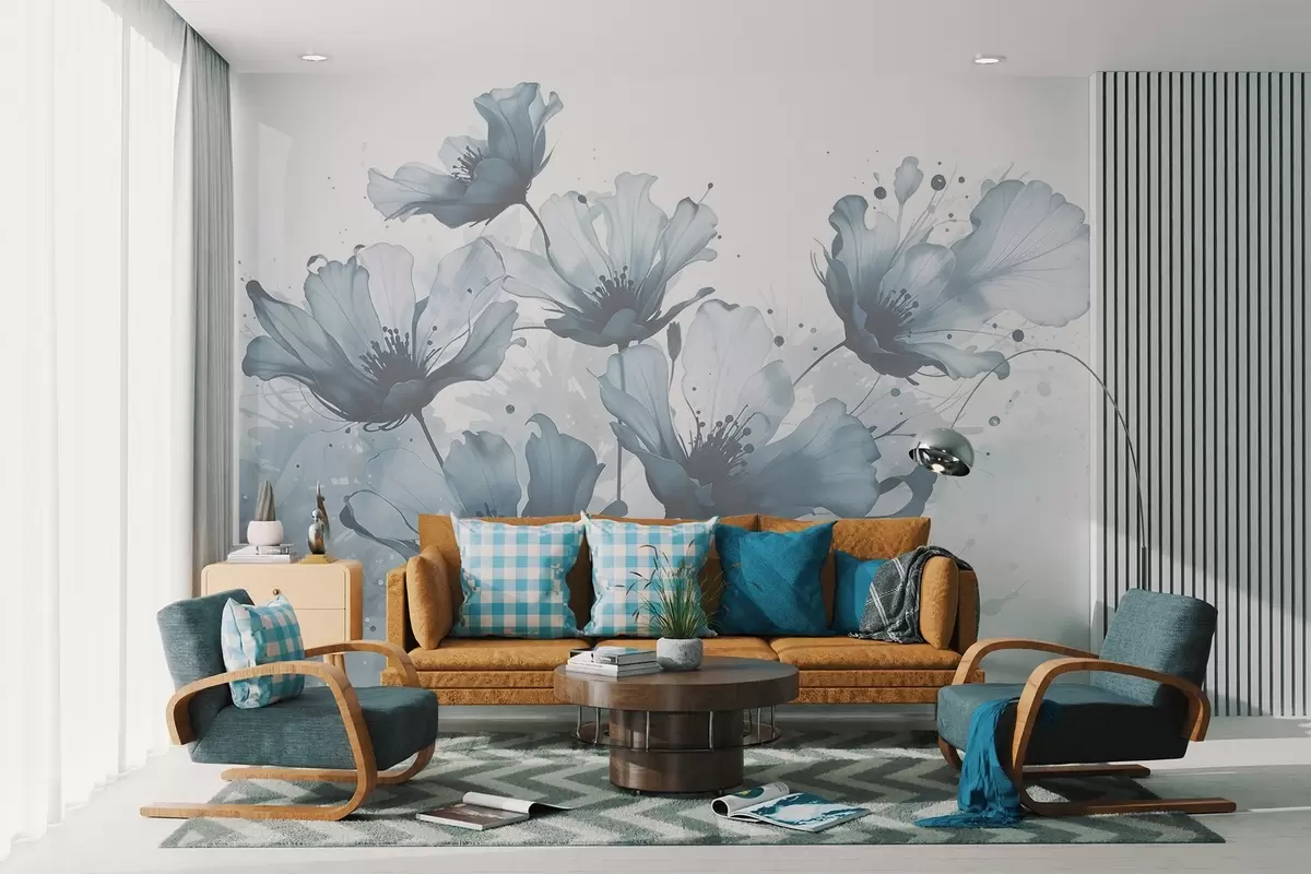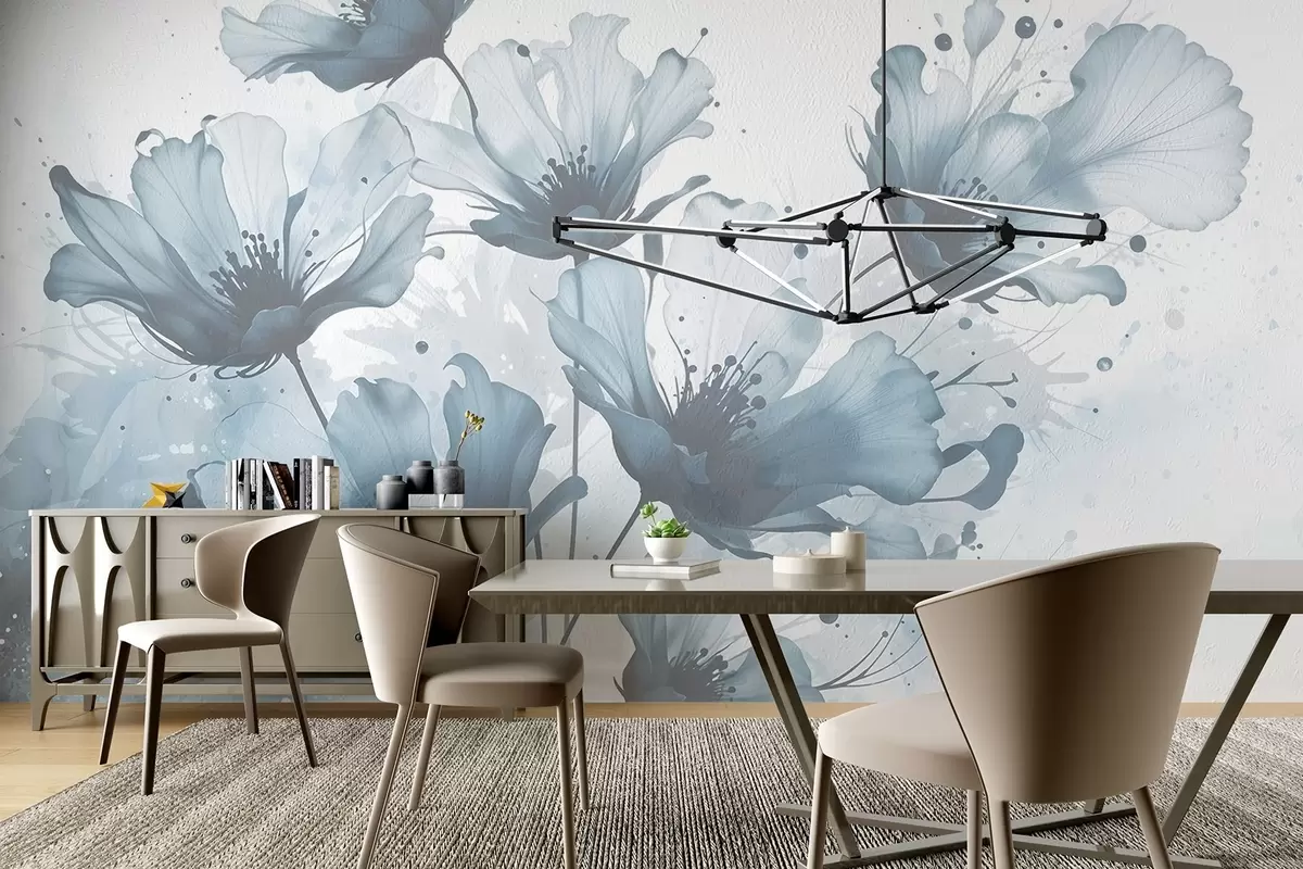 Fotomurales Delicadas flores azules con suaves pétalos difuminados y salpicaduras de acuarela sobre un fondo claro Nr. w08376