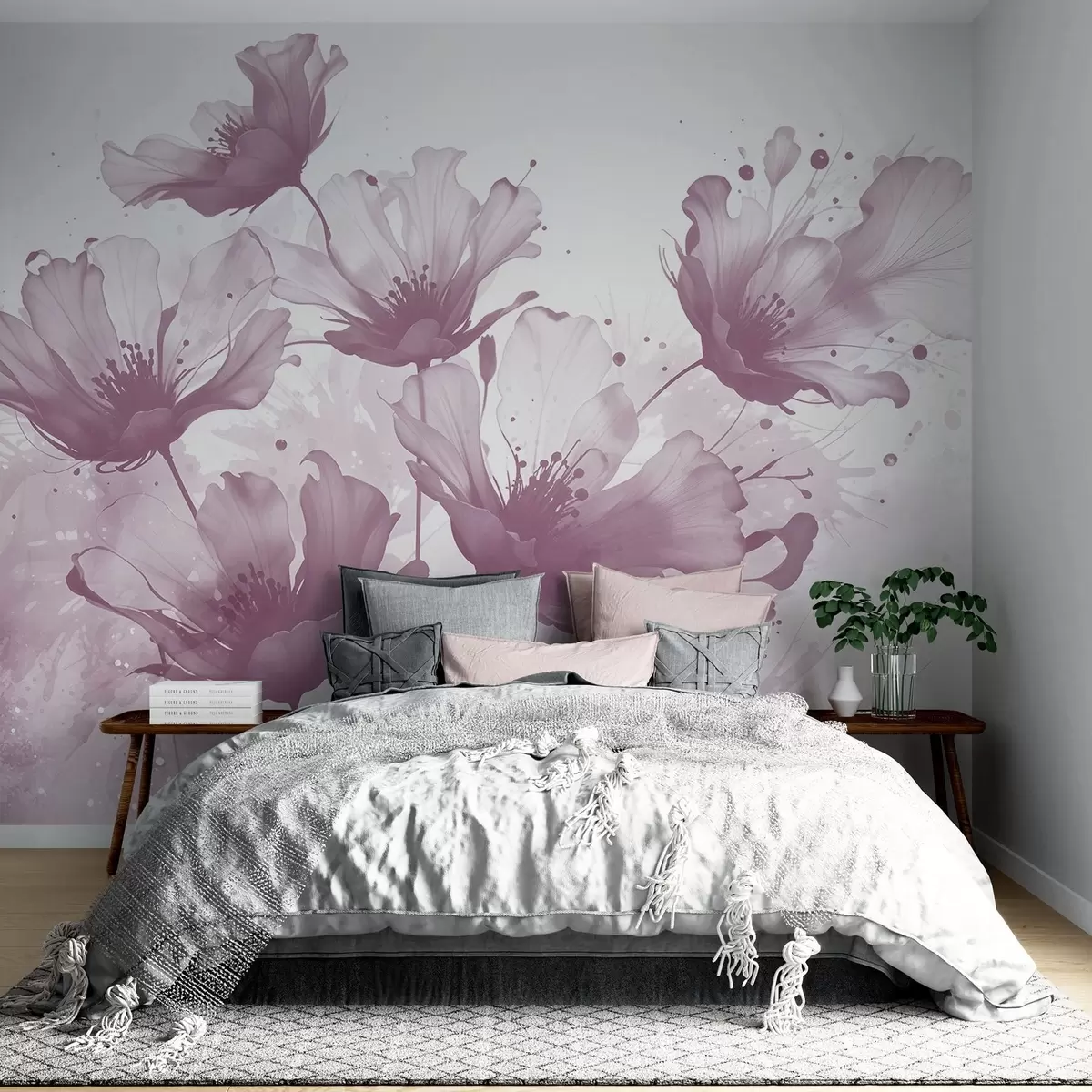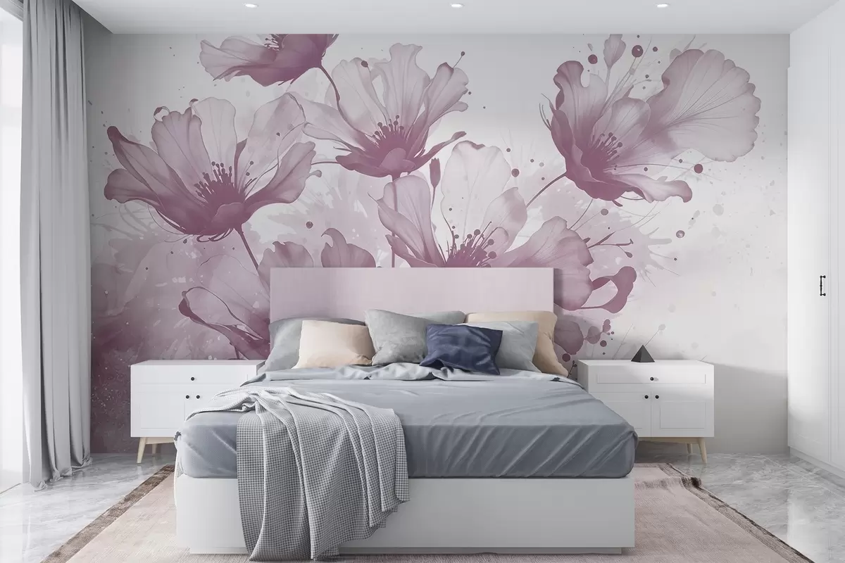 Fotomurales Delicadas flores rosas con pétalos suaves y difuminados y salpicaduras de acuarela sobre un fondo claro Nr. w08376v2