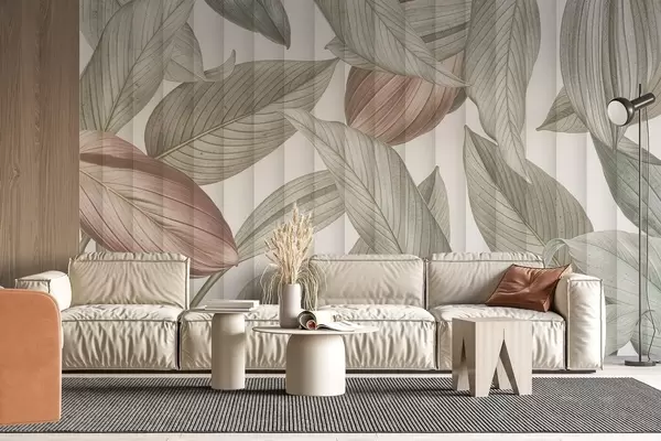 Fotomurales Hojas abstractas detalladas en tonos verdes, grises y naranja pastel sobre fondo claro Nr. w08388