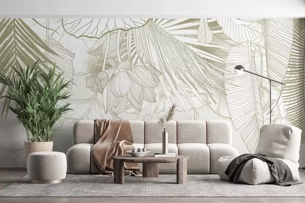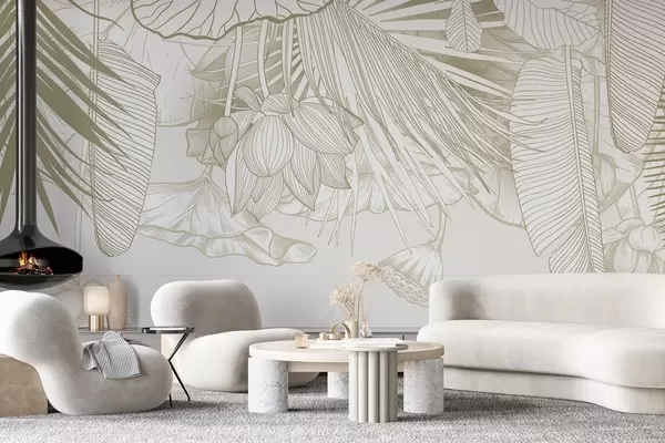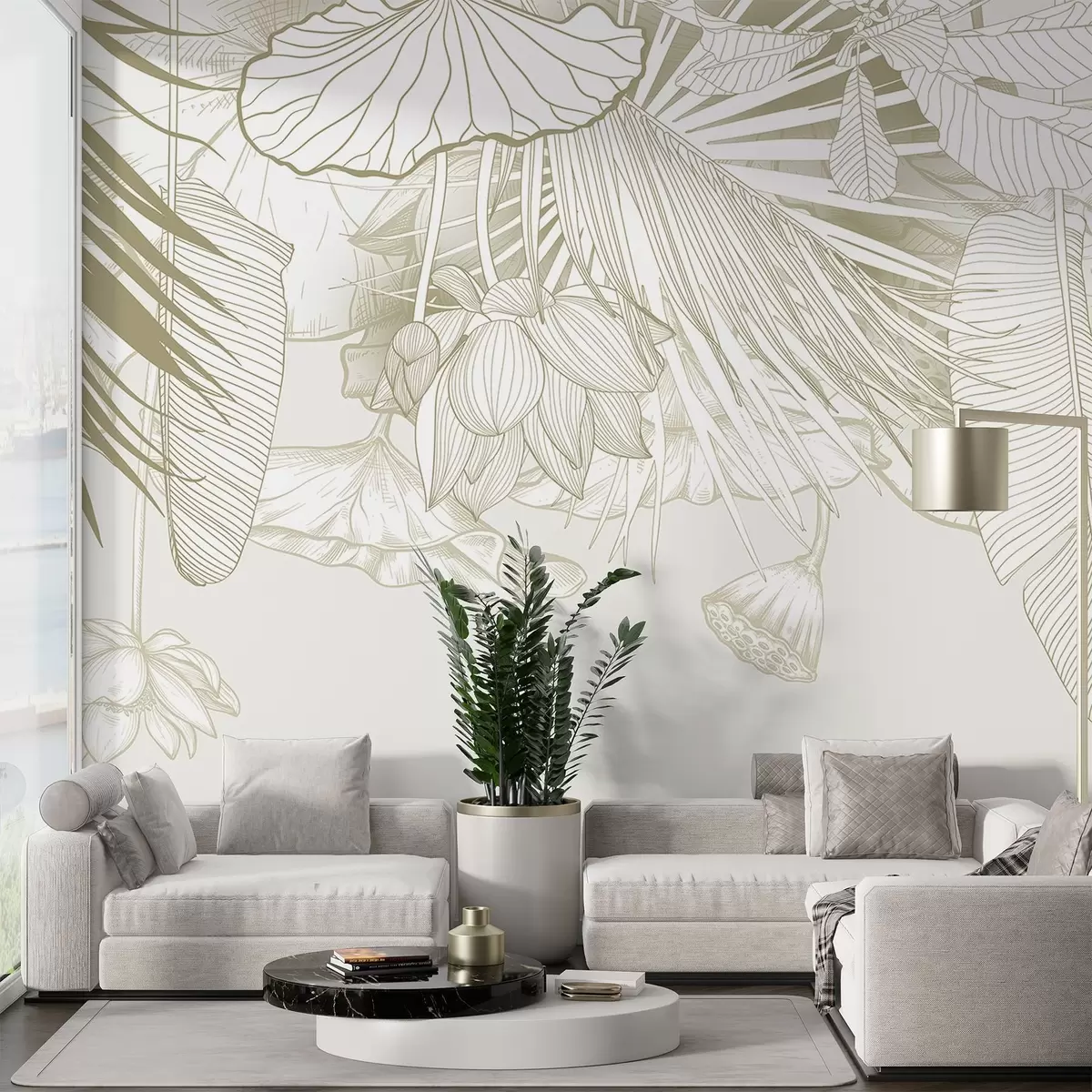 Fotomurales Un primer plano de un estampado floral beige con grandes pétalos y hojas superpuestas en un color monocromo Nr. w08389